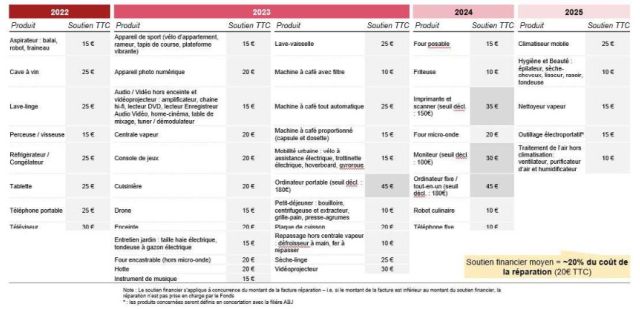 Entre 2022 et 2025, ce sont 68 équipements électriques et électroniques qui seront progressivement concernés. Découvrez ci-dessous les montants des soutiens financiers par appareil proposés pour le lancement du dispositif, sous