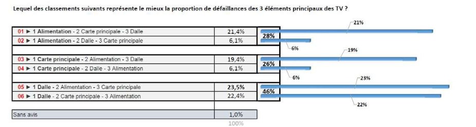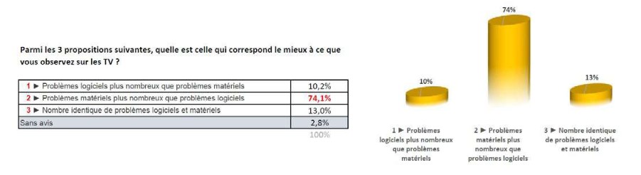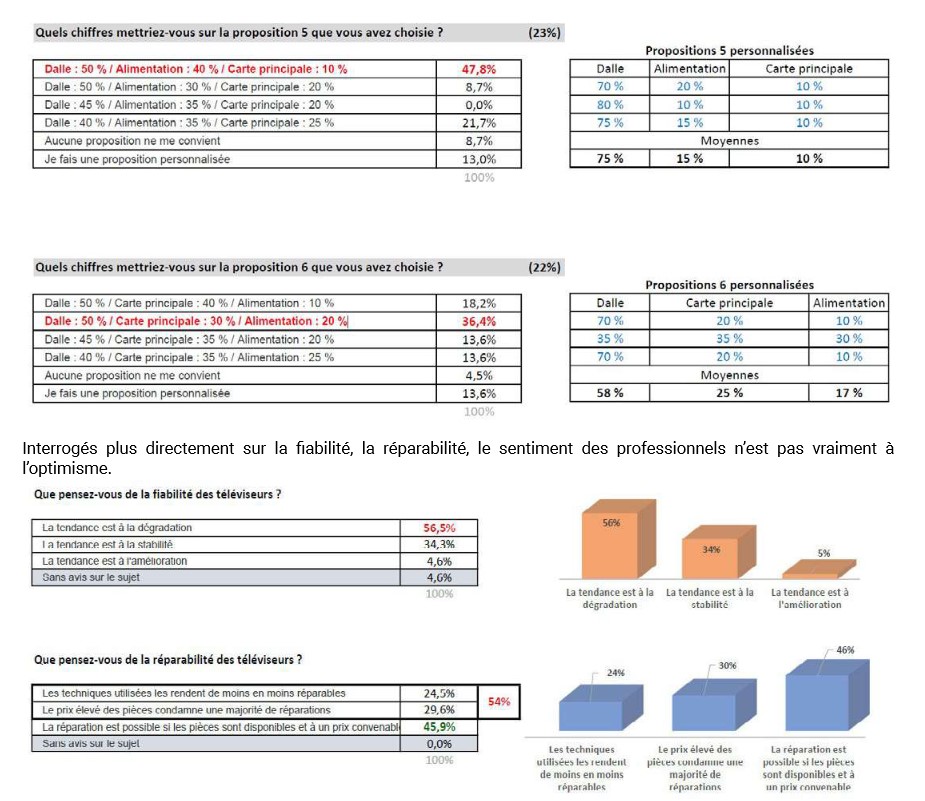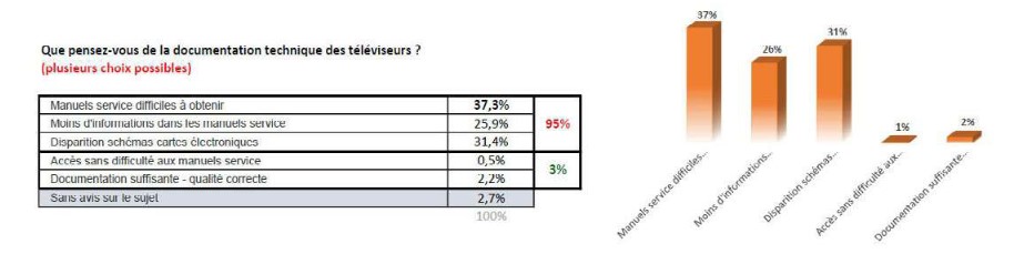 Quant à la qualité de la documentation technique, les avis plongent dans le négatif. Difficultés d’accès aux documentations, disparition souvent constatée des schémas des cartes électroniques, faiblesse du contenu chez plusieurs grands fabricants sont à l’origine de cette sévérité. Ce chiffre de 3% à peine de réparateurs satisfaits peut donner une impression d’exagération, mais ce faible pourcentage est tout simplement le reflet de l’exaspération des techniciens qui voient très régulièrement des téléviseurs dont le cycle de vie est écourté en raison des moyens insuffisants mis à leur disposition.