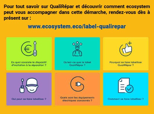 • Profiter d’une meilleure visibilité en étant référencé dans l’Annuaire des réparateurs labellisés, en ligne sur le site www.ecosystem.eco au second semestre 2022.