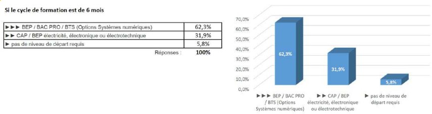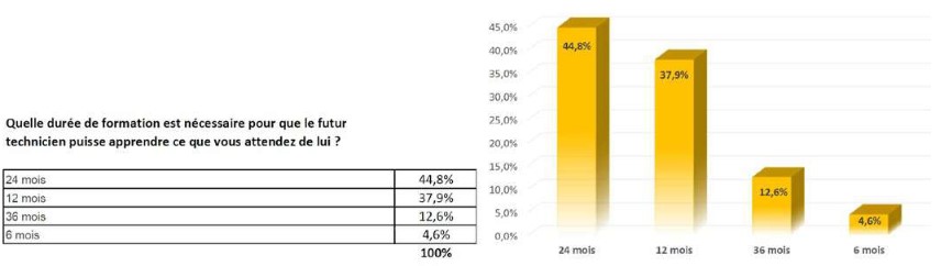 Quant au temps de formation nécessaire, près de 46% des professionnels interrogés estiment qu’il doit être de 24 mois. Moins de 5% pensent que 6 mois suffisent, alors que certaines entreprises, dans un besoin impératif de techniciens, forment des intervenants dans cette durée ; ce n’est pas ce que les professionnels attendent.